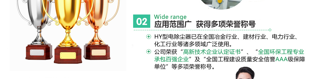 公司目前主營業務有MY系列靜電除塵器、袋式除塵器、電袋復合式除塵器、氣力輸灰系統、爐內噴鈣系統、脫硫脫硝系統、煙氣脫白等大氣污染治理產品的設計、制造、安裝、調試,各種老式除塵器的維修、改造,除塵器的各種配件的銷售等。